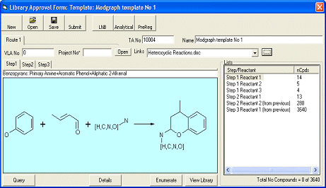 Reaction Based EnumerationModgraph Consultants Ltd, using the remarkably powerful technology from Daylight CIS, Inc. have developed a reagent and reaction based enumeration system which uses the natural language of the chemist chemical structures and reactions. As you select your reactions the program automatically presents you with a list of appropriate reactants. It is even possible to trace back and retrieve a complete list of every reactant used to produce each of your library compounds. System ArchitectureThe client runs under Windows 2000, NT or XP. The server runs on either Linux or Unix Solaris and requires Daylight SMILES, SMARTS and reaction toolkits. DayCart and Oracle® are required for data storage.