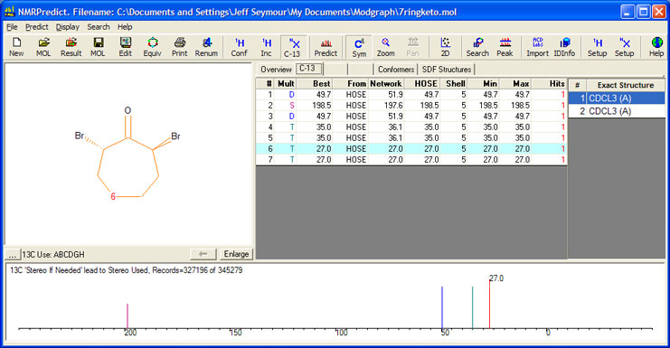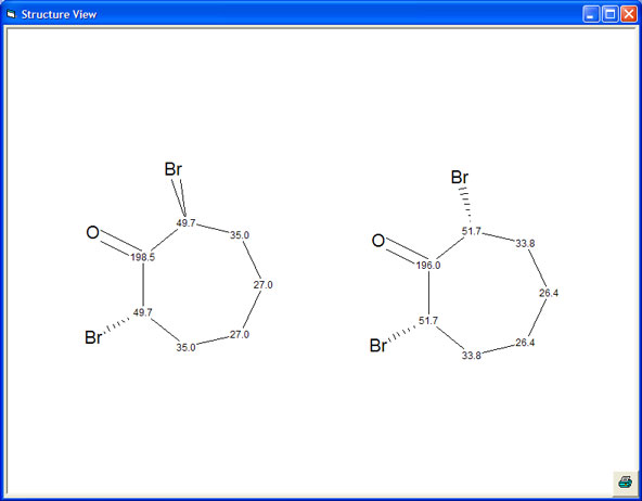 These 7-membered ketones have been selected to demonstrate the capabilities of the stereo recognition implemented into NMRPredict. From a "flat" basis, with no consideration given to stereochemistry, two exact matches exist in the database (this can be seen under "Exact Structure"). However it can be seen that the HOSE code uses only the one correct stereoisomer for prediction. It should also be noticed that the Neural Network is also able to correctly reproduce the trends induced by changing the stereochemistry, even at ring carbons C4 and C5 (corresponding to C4/5 and C6/7 in the picture below).