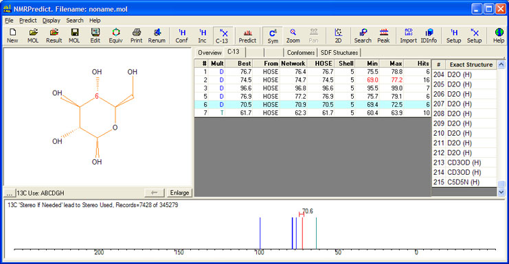Stereochemistry - SugarThe example below shows how critical it is to use stereochemistry in the prediction of sugars. The prediction of the flat molecule, with no stereochemistry drawn, shows that there are 215 exact structures in the database which match the sugar and that the range of values used for prediction varies from 10 to 21 ppm. There can be no confidence in a prediction with such a range and the prediction is of no value for assignment and structure verification.